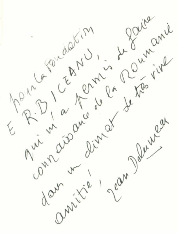Marţi, 25 octombrie 2011, Profesorul Delumeau a vizitat, la invitaţia Dnei Ioana Feodorov, împreună cu Dnii Constantin Erbiceanu şi Nicolae Drăguşin, Biblioteca Academiei Române, unde a putut admira valoroase manuscrise rare şi stampe.