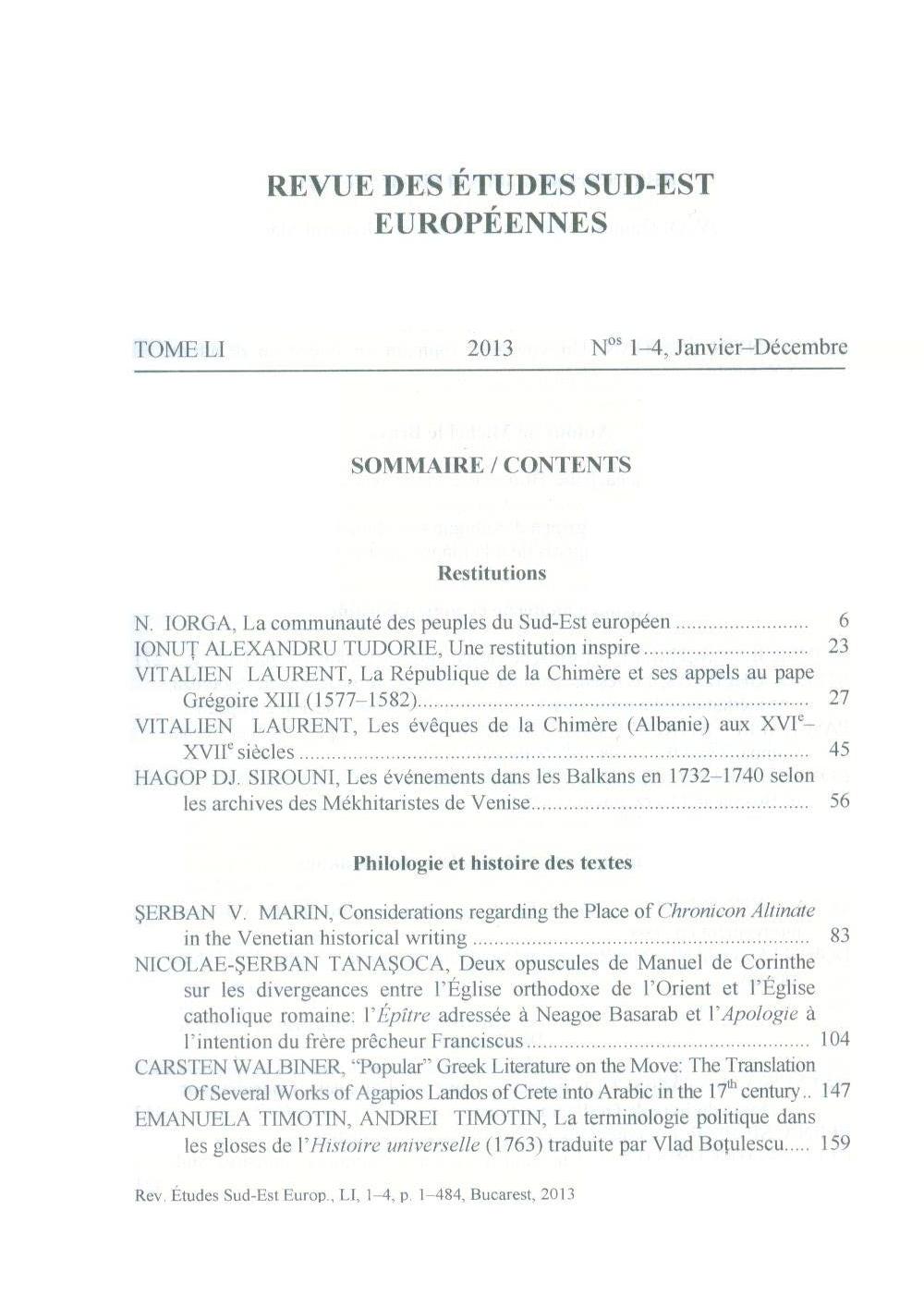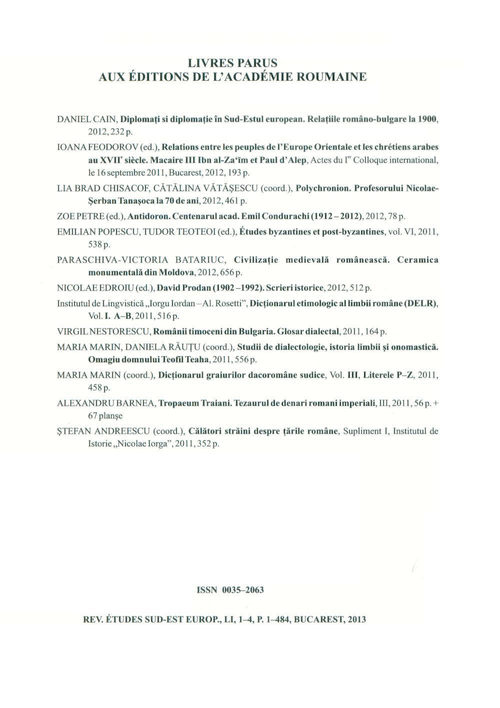 Reputatul Institut de Studii Sud-Est Europene aparţinând Academiei Române publică anual o revistă de specialitate difuzată în ţară şi îndeosebi în străinătate. Anul acesta volumul de comunicări ştiinţifice a depăşit cadrul bugetului alocat, încât conducerea Insitutului a apelat la Fundaţia Culturală Erbiceanu rugând-o să cofinanţeze publicarea revistei la Editura Academiei. Volumul cuprinzând circa 500 pagini a fost lansat în cursul săptămânii şi cuprinde sigla FCE.