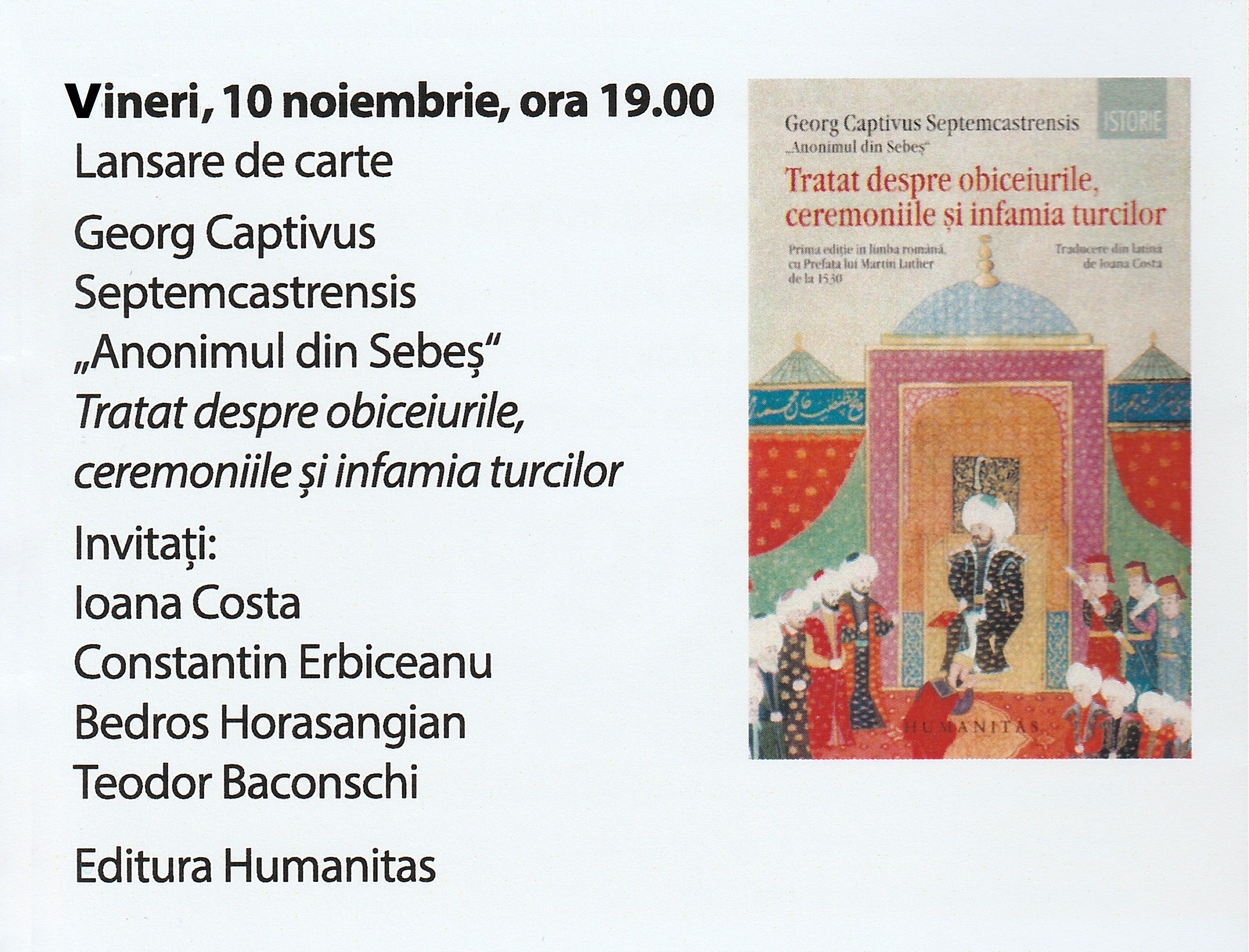 Editura Humanitas a acceptat propunerea Fundației Culturale Erbiceanu (FCE) să traducă din latină în limba română și să adauge câteva ilustrații semnificative cartea lui George Captivul (zis și Anonimul din Sebeș), Tratat despre obiceiurile, ceremoniile și perfidia Turcilor. Prima ediție a cărții a apărut în 1481, la Urach (Pădurea Neagră). De atunci, în secolele XV și XVI cartea a cunoscut peste 25 de ediții, fiind un adevărat best-seller. Dovadă a succesului, cartea a ajuns și pe masa lui Martin Luther care, la ediția din 1530, i-a adăugat o prefață laudativă. Astăzi cartea circulă într-o ediție critică, alcătuită în Germania, foarte greu accesibilă. Apariția în limba română a cărții scrisă de un autor născut pe teritoriul României, având o viață demnă de film, cu prefață semnată de Martin Luther, la 500 de ani de la Reforma pe care a declanșat-o, sunt motive de a nu ocoli participarea la acest eveniment editorial. Lansarea va avea loc vineri, 10 noiembrie, începând cu ora 19, la Librăria Humanitas Cișmigiu. Vor vorbi: traducătorul Dr. Ioana Costa, eseistul și diplomatul Teodor Baconschi, scriitorul Bedros Horasangian și Constantin Erbiceanu, președinte-fondator al FCE. Vă așteptăm!