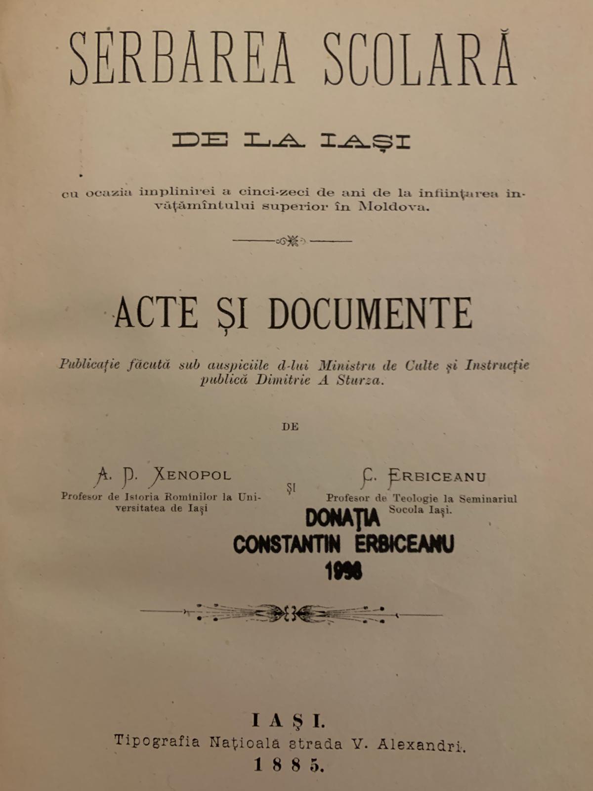 Volumul pe care l-am regăsit și despre care vă scriu este Serbarea școlară de la Iași. Acte și documente, publicat la Iași în 1885, „cu ocazia împlinirii a cincizeci de ani de la înființarea învățământului superior în Moldova”, sub auspiciile ministrului Dimitrie A. Sturdza, avându-i ca autori pe A.D. Xenopol și C. Erbiceanu. Exemplarul meu poartă și o ștampilă de donație – un detaliu care, dincolo de valoarea bibliografică, vorbește și despre continuitatea memoriei culturale legate de aceste nume.